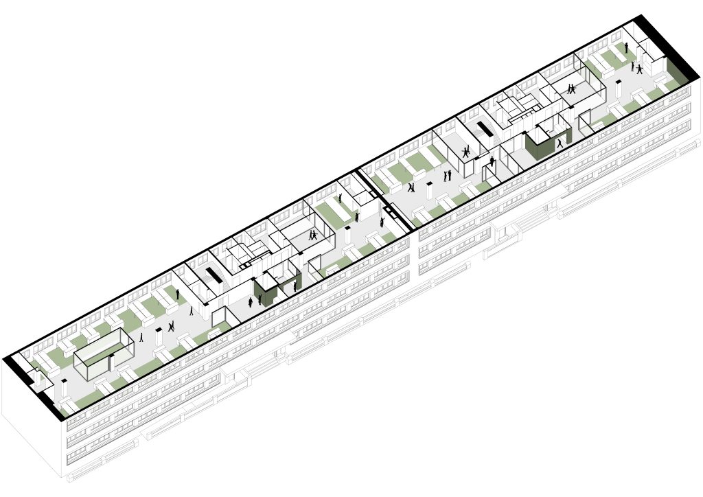 - Le réaménagement intégral sur 3 niveaux des espaces de travail, salles de réunions, halls, espaces de convivialité, locaux annexes et circulations verticales et horizontales ;