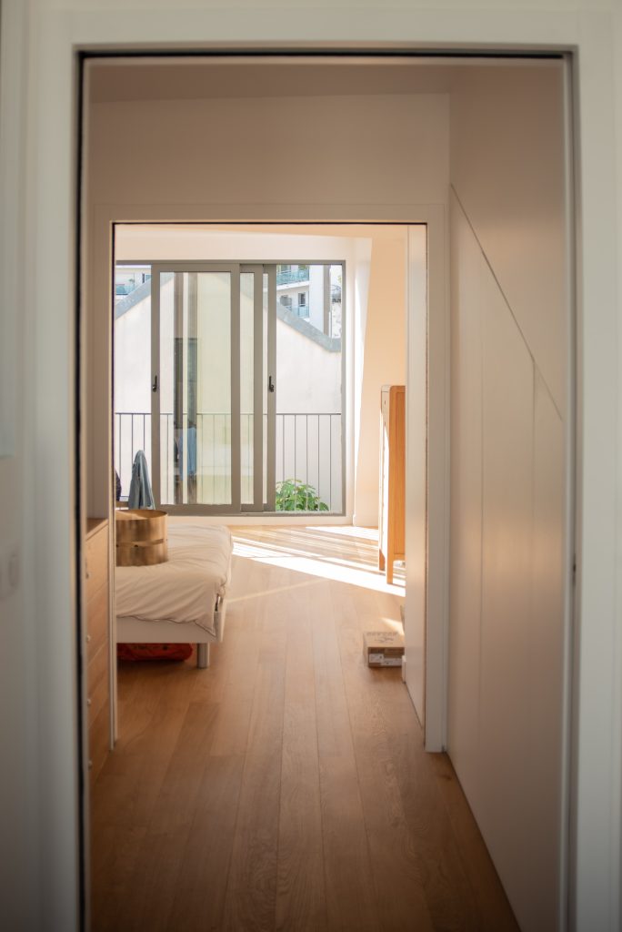 Plus qu’une surélévation, il s’agissait de valoriser les combles existants avec sobriété, par une nouvelle qualité d’habiter, en offrant un espace intérieur à la géométrie particulière qui permet de lire l’intervention architecturale tout en s’ouvrant largement sur l’extérieur.