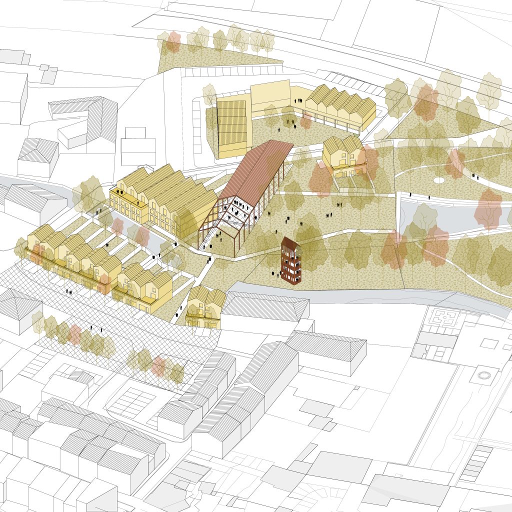 Témoin privilégié de l’histoire industrielle et sociale de la ville, la friche industrielle présente un enjeu de renouvellement urbain majeur pour la ville. Son emprise foncière lui permet d’accueillir un programme mixte et varié et l’aménagement d’espaces publics en lien avec le parc de la Schanze et le cœur de ville. La création d’une nouvelle entrée de ville depuis la départementale engage la transformation de cet axe en boulevard urbain et reconnecte le cœur historique à la partie nord de la ville.