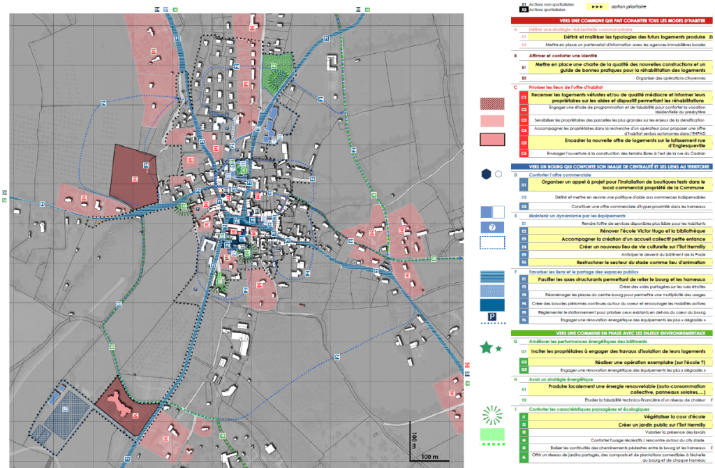 En se basant sur les projets en cours et sur les secteurs à enjeux identifiés (futur lotissement, garage Hermilly, école Victor Hugo,…) , l’étude avait pour vocation de définir de manière concertée, avec les partenaires et les habitants, un plan guide pour le réaménagement du bourg de Cambremer en définissant une feuille de route sur les actions à mener pour les prochaines années.