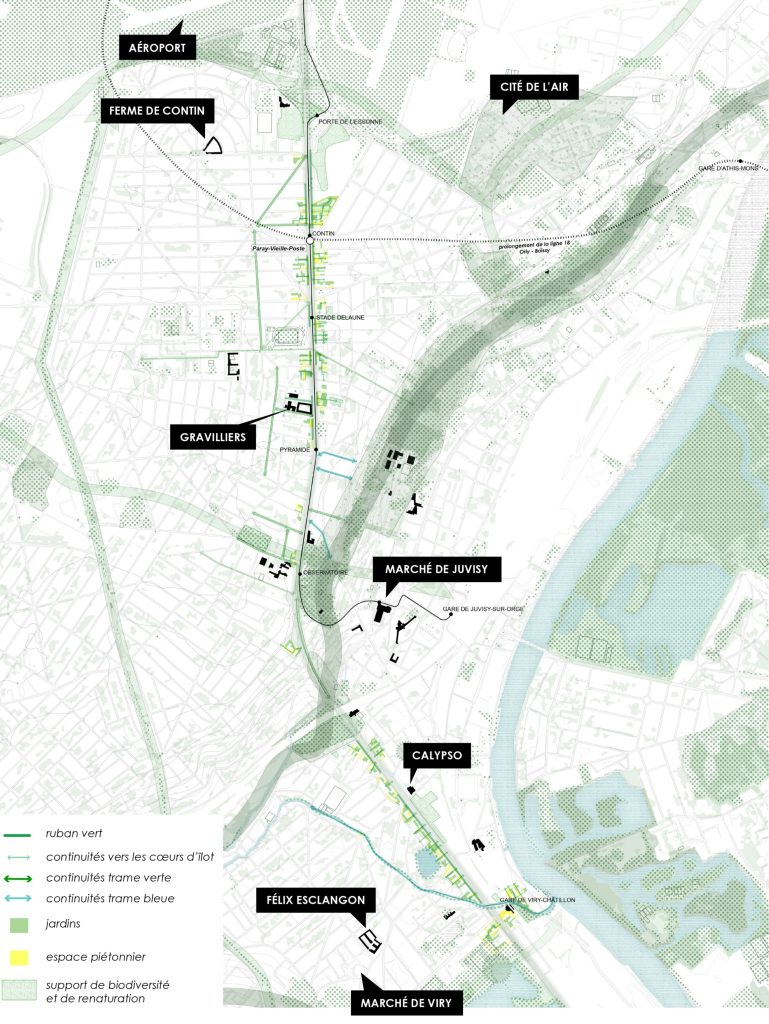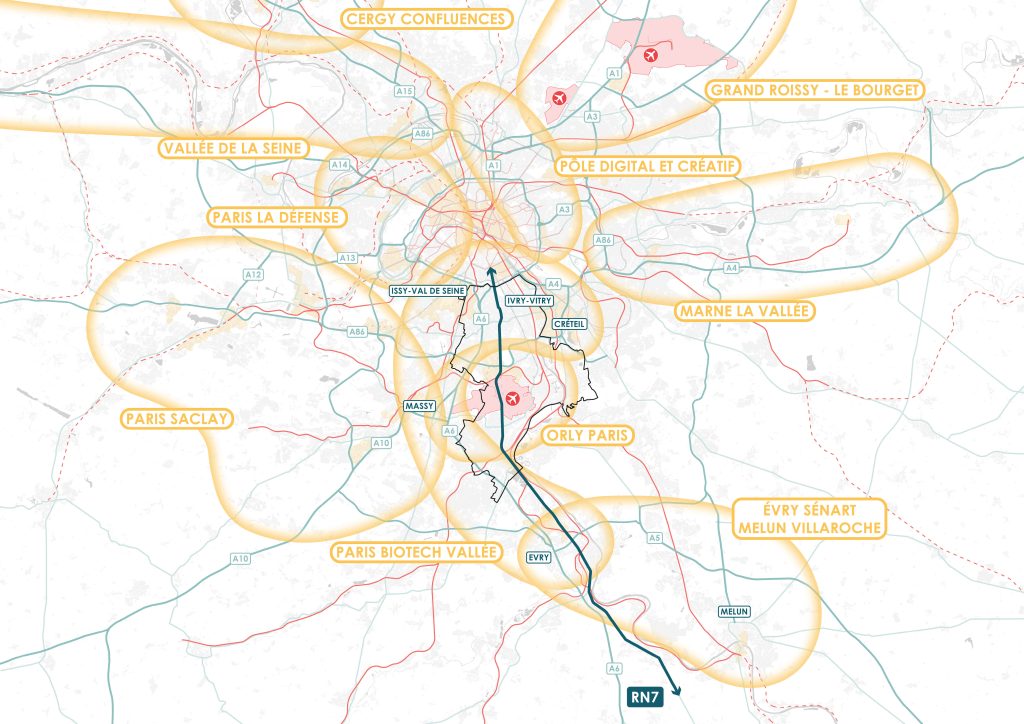 Sur un linéaire de plus de 6 km, cette étude prospective explore les conditions d’un renouvellement urbain linéaire, capable de concilier renaturation, mobilités actives, formes urbaines adaptées au contexte local et diversification des usages le long de l’axe. En prenant appui sur le réseau existant (gares RER, futur métro 18, T7, axes structurants), le projet vise à recomposer les franges de la RN7, aujourd’hui très marqués par l’omniprésence de la voiture – tant d’un point de vue des mobilités que des activités présentes le long de l’axe – pour en faire un véritable lieu de centralité, vecteur d’attractivité et de respiration pour les habitants.
